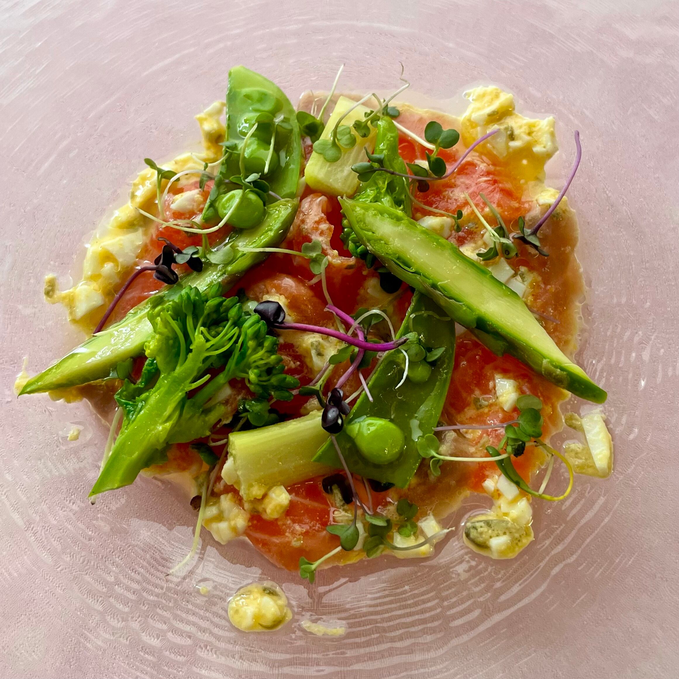 サクラマスのマリネ桜入りグルヴィッシュソース:卵・鮭・キウイ・りんご